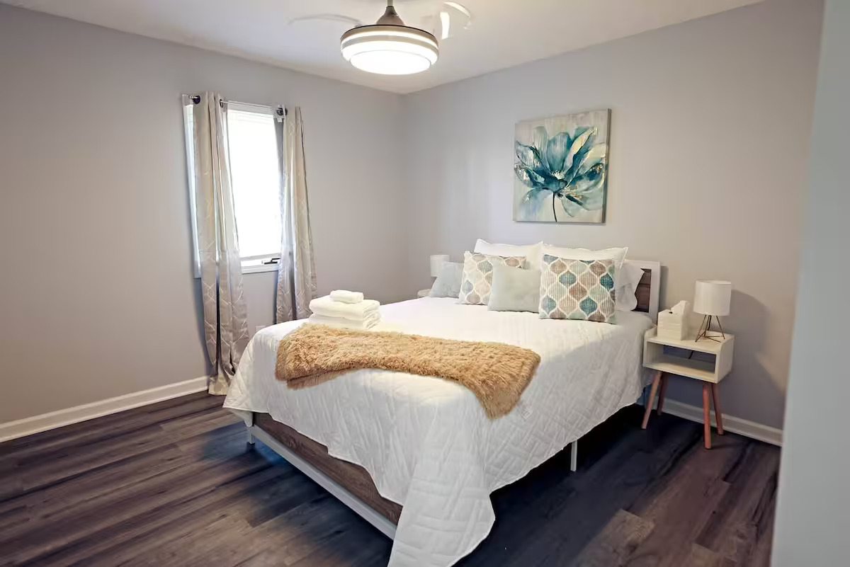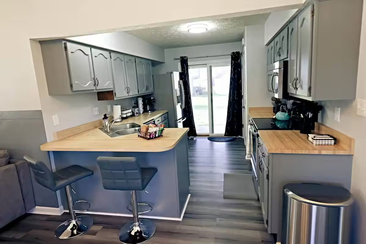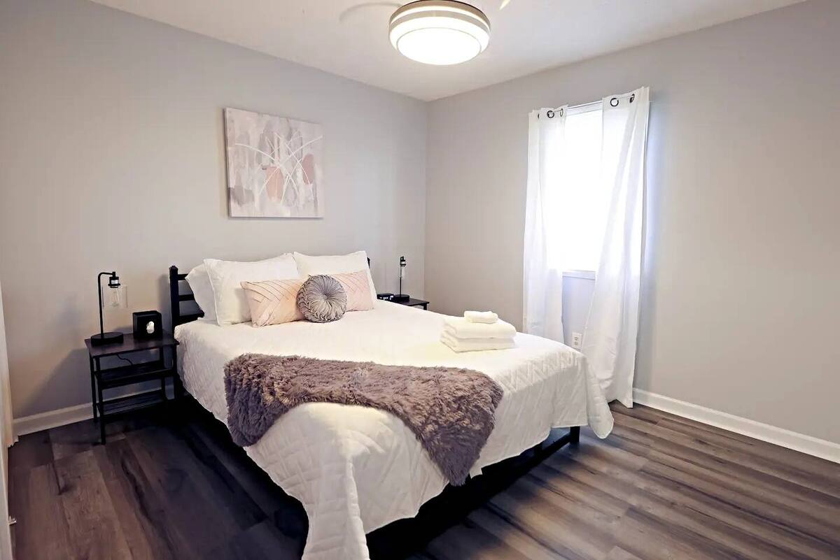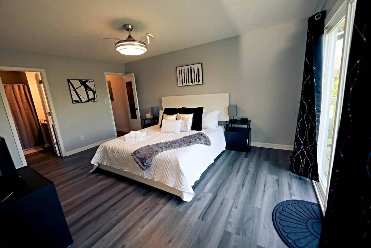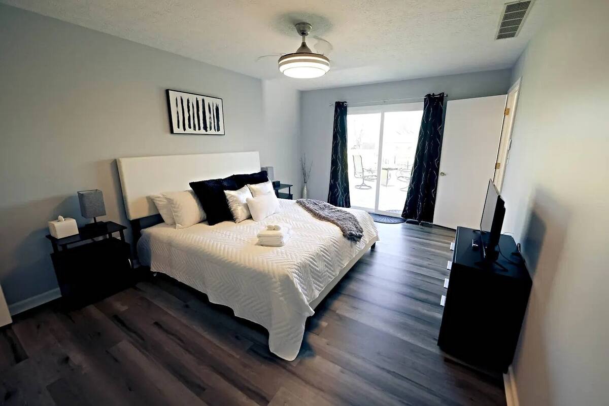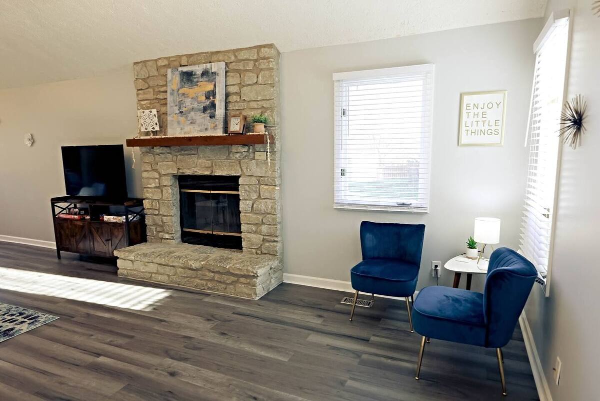 Unwind in this stylish 3-bedroom retreat just 7 minutes from the airport and 20 minutes from downtown Indy! Perfect for families, groups, or work trips, the home sleeps up to 8 with a king suite and 2 cozzy queen bedrooms. Enjoy the private deck, fire pit, and grill for relaxing evenings. Designed for longer & short stays, you’ll love the blazing 500+ Mbps WiFi, smart TVs in every room, a fully stocked kitchen, in-unit laundry, and plenty of parking for all guests. Comfort and convenience await!